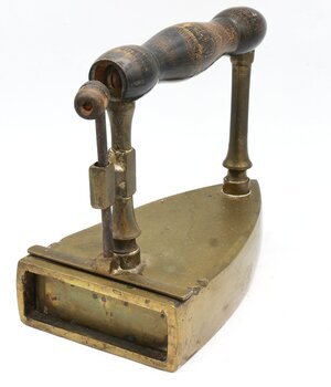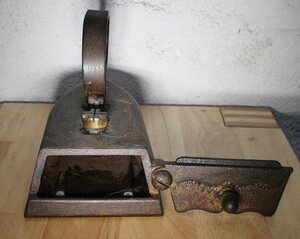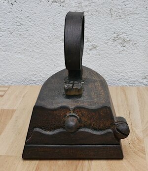 Flachbolzenbügeleisen (Kastenbügeleisen). In den Rumpf kann ein erhitzter Bolzen von hinten eingeführt werden. Mit diesem wird der Boden des Bügeleisens erhitzt. Der Innenraum kann mit einer drehbaren Klappe verschlossen werden, sodass der Eisenkeil nicht nach hinten herausfallen kann. Der Griff ist in rheinischer Form und ist beiden Seiten mit Rillen verziert. Er ist am Eisen mit 2 Schrauben mit riesigen Schraubenköpfen befestigt. Im Inneren befinden sich unten 2 Rippen die verhindern, dass der Eisenkeil direkt auf dem Boden aufliegt. Der Bolzen ist leider nicht mehr vorhanden.
