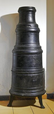Hülle eines Kohleofens mit auffälligen Wärmetauschern des Herstellers DE DIETRICH & G.NIEDERBRONN. Der Ofen besteht aus einer runden Brenn- und Aschekammer aus Gusseisen und einer Verkleidung aus Eisenblech. Der Rost im Inneren des Ofens, Griffe sowie die Schraube und der Schieber zur Regulierung der Luftzufuhr sind leider nicht mehr vorhanden. Der Ofen könnte auch verkleinert worden sein und ursprünglich weitere zusätzliche Wärmetauscher-Stockwerke besssen haben. De Diedrich baute neben traditionellen Produkten um 1900 an seinem Stammsitz in Niederbronn im Elsass auch Automobile. Aufschriften: Obere Ofenklappe: DE DIETRICH & CIE NIEDERBRONN Klappe zur Brennkammer: außen: DN (in einem Posthorn) innen: 85 - 5A