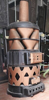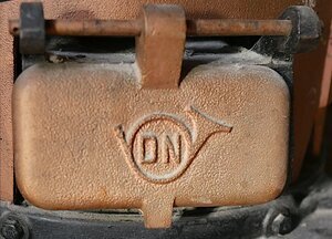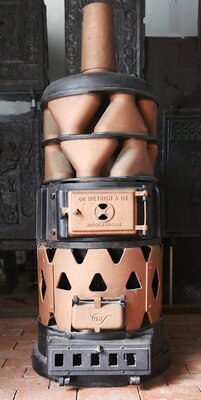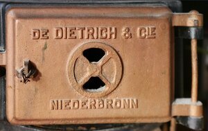Hülle eines Kohleofens mit auffälligen Wärmetauschern des Herstellers DE DIETRICH & G.NIEDERBRONN. Der Ofen besteht aus einer runden Brenn- und Aschekammer aus Gusseisen und einer Verkleidung aus Eisenblech. Der Rost im Inneren des Ofens, Griffe sowie die Schraube und der Schieber zur Regulierung der Luftzufuhr sind leider nicht mehr vorhanden. Der Ofen könnte auch verkleinert worden sein und ursprünglich weitere zusätzliche Wärmetauscher-Stockwerke besssen haben. De Diedrich baute neben traditionellen Produkten um 1900 an seinem Stammsitz in Niederbronn im Elsass auch Automobile. Aufschriften: Obere Ofenklappe: DE DIETRICH & CIE NIEDERBRONN Klappe zur Brennkammer: außen: DN (in einem Posthorn) innen: 85 - 5A