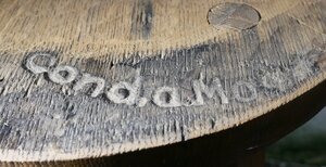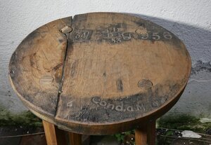 Hocker aus Holz mit 4 Füßen und Eichstempeln. Bei der Sitzfläche handelt es sich um den ehemaligen Deckel eines Holzfasses. Dies wegen der Zahl 956, hinter der vermutlich noch eine "l" für Liter folgte. Auf der Oberseite des Hockers befindet sich die Eichmarke 11 / DR / 53 bedeutet: 11: Eichaufsichtsbezirk Köln / 53 Eichamt Cochem (bestand bis 1958) , daneben im Schild 34 (bedeutet Eichung bis 1934) Am andern Ende der Oberseite befindet sich der Schriftzug Cond. a. M.... (wahrscheinlich Cochem a.d. Mosel). Die Oberfläche des Hockers wurde zu etwa 3/4 abgeschliffen, sodass das hellere Holz wieder zum Vorschein kam. Ausgenommen sind die Teile der Oberfläche mit den Inschriften, sodass diese erhalten wurden.