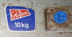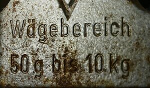 Tafelwaage aus dem Hause Rhewa (Rheinische Waagenfabrik A. Freudewald) nach dem Konstruktionsprinzip von Joseph Béranger mit vielen Eichstempeln von 1970 bis 2002. Eine Tafelwaage unterscheidet sich von einer einfachen Balkenwaage durch das Gestänge im Inneren. Dieses bewirkt, dass das Moment am Waagebalken von der Position der Gewichte auf der Schale unabhängig ist. Auch werden Schrägstellung als auch Standortbewegungen bei der Béranger-Waage besser kompensiert, was die Nutzungsmöglichkeiten der Tafelwaage wesentlich erweitert. Die Waage besitzt auf der einen Seite eine Halterung für die Schütte und auf der anderen Seite eine Tafel zur Auflage der Gewichte. Sie ist für ein Gewicht von bis zu 10 kg zugelassen. Sie besitzt auf der Vorderseite einen blauen Aufkleber mit dem damaligen Firmenlogo und der Aufschrift 10 kg. Rechts daneben befindet sich der blauen und runde Aufkleber der letztmaligen Eichung mit dem Code 4 / D für die Eichaufsichtsbezirk Bad Kreuznach (für ganz Rheinland-Pfalz) und der Jahreszahl 2002. Auf der Rückseite der Waage befindet sich ein identische Aufkleber des Herstellers und links daneben ein viereckiger blauer Aufkleber mit der Aufschrift Eichbehörde RheinlandPfalz geeicht bis 2002. Am Gestänge der Waage befindet sich ein als Schlagstempel der Eichstempel 11 / DR / 2 - es handelt sich hier um den Eichaufsichtsbezirk Köln, Eichamt Aachen mit den Jahrgangsstempeln für die Jahre 70, 78, 80, 82 - bis zu denen die jeweilige Eichung gültig war. Links daneben befinden sich Reste eines blauen Aufklebers an dem nur noch Reste der Zahl 92 zu erkennen sind. Des weiterem ist am gleichen Waagebalken der Schlagstempel Wägebereich 50 g bis 10 kg , das wohl ursprüngichze Logo (Kreis in Dreieck) der Rheinischen Waagenfabrik A. Freudewald und der Code "A 397e" angebracht. Bei letzterem handelt es sich um das Zulassungszeichen der Physikalisch Technischen Bundesanstalt (PTB) . Wir bedanken uns beim Landesamt für Mess- und Eichwesen Rheinland-Pfalz für die Informationen zum Eichwesen.