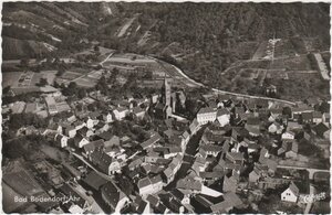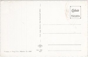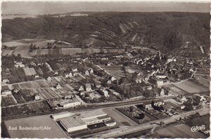 Karte im Hochformat mit gewelltem Rand und im SW-Druck. Die Vorderseite zeigt ein Luftbild im Anflug von Sudwest über den Ortskern. Hinter dem Ort an den Hängen des Reisberg sind Rest der Weinanbauflächen zu sehen. Im Bild von links eine großes Erdbeerfeld, das zum Thomashof gehört. Vorderseite unten links "Bad Bodendorf/Ahr"; rechts unten der Schriftzug "Cekade / Luftbild" Rückseite Mitte senkrecht "Bon 044/62/2 Agfa Foto Jupp Schuld, Bad Bodendorf (Ahr)". Im Wertmarkenfeld "Cekade / Originalfoto".