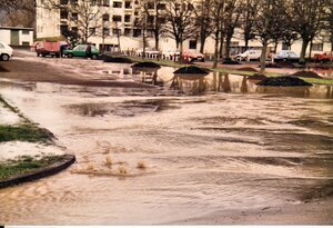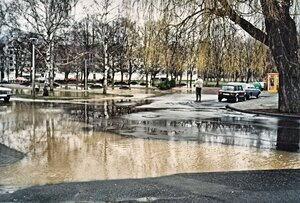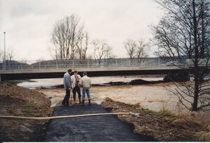 Sieben Fotografien zeigen eindrucksvoll den Wasserstand und das Tosen des kleinen aus der Eifel kommenden Flüsschen Ahr im Bereich des Kurparks von Bad Bodendorf.