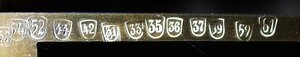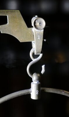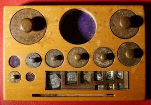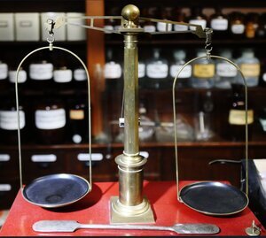 Apothekerwaage mit 2 Gewichtssätzen auf Holzsockel mit 2 Schubladen. In jeder Schublade befindet sich ein Gewichtssatz. Ein langer nach unten gerichteter Zeiger zeigt auf eine Skala auf der genau das Gleichgewicht festgesellt werden kann. Die Waage steht auf 4 höhenverstellbaren Füßen die dazu dienen die Waage horizontal eben auszurichten. Im Gewichtssatz finden sich Gewichtsstücke von 200g bis 10 mg. Dies spricht für eine extreme und für Arzneimittel notwendige Genauigkeit dieser Waage. Auf dem Waagebalken befinden sich Eichstempel (Schlagstempel) 22/ D ° R / 8 vom Eichaufsichtsbezirk Stuttgart, Eichamt Ebingen für die Jahre (bis zu denen die Eichung gültig war) 24, 27, 29, 31, 33, 35, 36, 37, 39, 42, 63, 55, 69, 52, 54, 57, 59, 61. Der ° zwischen D und R bedeutet, dass es sich um die Eichung einer Präzisionswaage (Feinwaage) handelt. Ein weiterer Schlagstempel ist nicht mehr lesbar. Die Waage war somit fast 40 Jahre in Gebrauch in einer Apotheke. Auch die Gewichte sind z.T. mit vielen Eichstempeln von 2 Eichämtern gestempelt: Bei 22/DR/1 handelt es sich um den Eichaufsichtsbezirk Stuttgart (22) mit dem Eichamt Stuttgart (1). Bei 22/DR/8 handelt es sich um den Eichaufsichtsbezirk Stuttgart (22) mit dem Eichamt Ebingen (8). Die Wahrscheinlichkeit ist demnach groß, dass die Gewichtstücke von der Fa. Kern stammen, die heute (2023) noch ihren Sitz in Albstadt-Ebingen hat. Wir bedanken uns beim Landesamt für Mess- und Eichwesen Rheinland-Pfalz für die Informationen zum Eichwesen.