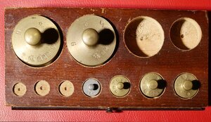 Apothekerwaage mit 2 Gewichtssätzen auf Holzsockel mit 2 Schubladen. In jeder Schublade befindet sich ein Gewichtssatz. Ein langer nach unten gerichteter Zeiger zeigt auf eine Skala auf der genau das Gleichgewicht festgesellt werden kann. Die Waage steht auf 4 höhenverstellbaren Füßen die dazu dienen die Waage horizontal eben auszurichten. Im Gewichtssatz finden sich Gewichtsstücke von 200g bis 10 mg. Dies spricht für eine extreme und für Arzneimittel notwendige Genauigkeit dieser Waage. Auf dem Waagebalken befinden sich Eichstempel (Schlagstempel) 22/ D ° R / 8 vom Eichaufsichtsbezirk Stuttgart, Eichamt Ebingen für die Jahre (bis zu denen die Eichung gültig war) 24, 27, 29, 31, 33, 35, 36, 37, 39, 42, 63, 55, 69, 52, 54, 57, 59, 61. Der ° zwischen D und R bedeutet, dass es sich um die Eichung einer Präzisionswaage (Feinwaage) handelt. Ein weiterer Schlagstempel ist nicht mehr lesbar. Die Waage war somit fast 40 Jahre in Gebrauch in einer Apotheke. Auch die Gewichte sind z.T. mit vielen Eichstempeln von 2 Eichämtern gestempelt: Bei 22/DR/1 handelt es sich um den Eichaufsichtsbezirk Stuttgart (22) mit dem Eichamt Stuttgart (1). Bei 22/DR/8 handelt es sich um den Eichaufsichtsbezirk Stuttgart (22) mit dem Eichamt Ebingen (8). Die Wahrscheinlichkeit ist demnach groß, dass die Gewichtstücke von der Fa. Kern stammen, die heute (2023) noch ihren Sitz in Albstadt-Ebingen hat. Wir bedanken uns beim Landesamt für Mess- und Eichwesen Rheinland-Pfalz für die Informationen zum Eichwesen.