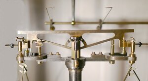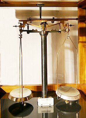 Analysewaage (Apothekerwaage, Feinwaage) in einer Glasvitrine des Herstellers Becker Fils & Co, H.L. auf einer Marmorplatte. Verstellbare Füße zur Optimierung des Gleichgewichts. Die Waage besitzt eine sehr komplexe Mechanik. Sie besitzt mehrere Kalibrierungs- Möglichkeiten aber keine Eichstempel. Vorne links unter der Skala befindet sich das Logo des Herstellers Becker Fils & Co, H.L., ein fliegender Adler vor eine Fahne.