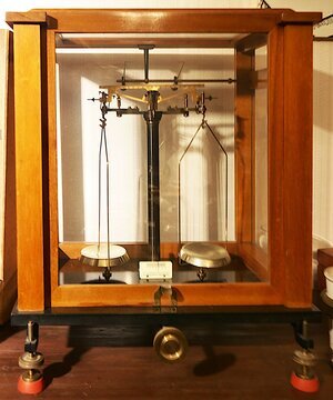 Analysewaage (Apothekerwaage, Feinwaage) in einer Glasvitrine des Herstellers Becker Fils & Co, H.L. auf einer Marmorplatte. Verstellbare Füße zur Optimierung des Gleichgewichts. Die Waage besitzt eine sehr komplexe Mechanik. Sie besitzt mehrere Kalibrierungs- Möglichkeiten aber keine Eichstempel. Vorne links unter der Skala befindet sich das Logo des Herstellers Becker Fils & Co, H.L., ein fliegender Adler vor eine Fahne.