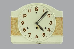 Weißglasierte Keramikblende mit waagerecht verlaufendem Schmuckband in Natursteinoptik. Das runde Ziffernblatt ist mit Zahlen von 1 bis 12 und einer Minuteneinteilung versehen. Das mechanische Uhrwerk ist in einer Dose rückseitig eingebaut, die einen Durchmesser von 145 mm und eine Tiefe von 50 mm hat. Aufgehangen wird die Uhr an einer gelochten Metallplatte, die mit dem Uhrengehäuse verbunden ist. Rückseitig ragt aus dem Uhrengehäuse ein Draht, mit dem die (Unruhe der) Uhr angehalten werden kann. Zur Uhr gibt es noch den original Uhrenschlüssel, mit dem das Uhrwerk aufgezogen werden musste.