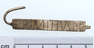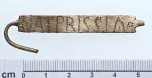 Der Anhänger ist vermutlich Teil eines persönlichen Geschenks. Der in kleinen Punkten gepunzte Text PRIMITIVS DO/NAT PRISSIA – Primitius schenkt Prissia, befindet sich auf beiden Seiten und nur durch Drehen des Anhängers ist die kurze Inschrift zu verstehen. Das kleine Efeublatt am Zeilenende deutet auf innige Zuneigung hin.