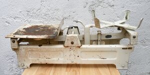 Weiß lackierte Tafelwaage des Herstellers Mikro Waagenfabrik Döft oHG nach dem Konstruktionsprinzip von Joseph Béranger. Eine Tafelwaage unterscheidet sich von einer einfachen Balkenwaage durch das Gestänge im Inneren. Dieses bewirkt, dass das Moment am Waagebalken von der Position der Gewichte auf der Schale unabhängig ist. Auch werden Schrägstellung als auch Standortbewegungen bei der Béranger-Waage besser kompensiert, was die Nutzungsmöglichkeiten der Tafelwaage wesentlich erweitert. Die Waage besitzt auf der einen Seite eine Halterung für die Schütte und auf der anderen Seite eine Tafel zur Auflage der Gewichte. Sie ist für ein Gewicht von bis zu 10 kg zugelassen. In der Mitte der Waage befindet sich auf der Front- und auf der Rückseite ein Aufkleber mit dem oben dem Adlerlogo der Firma Mikro Waagenfabrik Döft oHG und darunter ein Aufkleber mit dem Text 10kg. Am Gestänge der Waage befindet sich als Schlagstempel ein sehr schlecht lesbare Eichstempel - möglicherweise 22 / DR / 5 . Es handelt sich hier um den Eichaufsichtsbezirk Stuttgart, Eichamt Eichamt Heilbronn oder dessen Nebenstellen in Öhringen oder Künzelsau. Rechts daneben befinden sich mehrere Jahrgangsstempeln (bis zu dem die jeweilige Eichung gültig war) von 58 für das Jahre 1958 bis 74 für das Jahr 1974. D.h. die Waage muss zwischen 1948 (Gründung der Firma) und 1956 (Eichung bis 1958) gebaut worten sein. Auf der Waage befindet sich ein Aufkleber "Haushaltswaage", der wohl im Zusammenhang mit dem Eintrag in das Eingangsbuch angebracht worden ist. Vielleicht war sie dies zum Ende ihres praktischen Einsatzes, aber vorher war sie definitiv im gewerblichen Einsatz, da sie als Haushaltswaage definitiv nicht so oft geeicht worden wäre. Ein auf der Waage liegender Holzteller mit der Aufschrift Kurt Sambale ff. Fleisch- u. Wurstwaren L i p p s t a d t Tel. 2951 könnte vom letzten Einsatzort stammen. Wir bedanken uns beim Landesamt für Mess- und Eichwesen Rheinland-Pfalz für die Informationen zum Eichwesen.