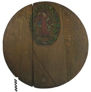 Fassboden: rund mit Figur Dorothea, die von Weinreben umrankt ist