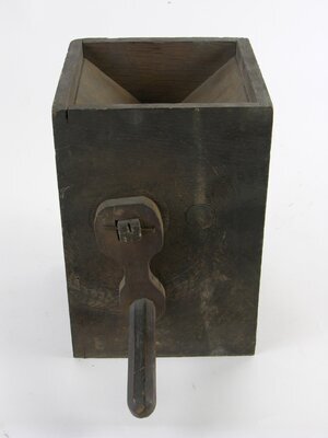 Es handelt sich bei dem Objekt um eine Holzmühle. Die kleine Traubenquetsche hat die Form eines Kastens. Angebracht ist ein beweglicher Griff mit Holzwalze. Es fehlen der Mühlenboden und die Schublade. An der Mühle ist ein Etikett mit folgender Inschrift angebracht: °Geschenk des Herrn Heinrich Schwaab, Küfermeister zu Speyer°. Eine Traubenmühle ist ein mechanisches Gerät für das Quetschen von Weintrauben. Bei der Rotweinbereitung wird damit die Maische für die Maischegärung erzeugt, deshalb wird der Vorgang auch als Maischen bezeichnet. Bei der Weißweinbereitung erfolgt dies unmittelbar vor dem Pressen. Die Trauben werden dabei zwischen zwei Walzen angequetscht, damit der Saft beim Pressen leichter austreten kann. Außerdem werden dadurch Enzyme, Extrakt- und Aromastoffe freigesetzt. Dabei sollten die Kerne und (falls diese noch vorhanden) Stiele möglichst nicht verletzt werden, um das Austreten der bitteren und bei zu großer Menge unangenehm schmeckenden Gerbstoffe zu verhindern, die besonders in grünen Stielen von Trauben enthalten sind.
