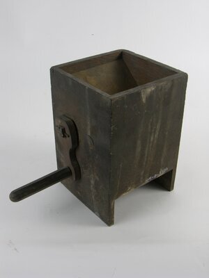 Es handelt sich bei dem Objekt um eine Holzmühle. Die kleine Traubenquetsche hat die Form eines Kastens. Angebracht ist ein beweglicher Griff mit Holzwalze. Es fehlen der Mühlenboden und die Schublade. An der Mühle ist ein Etikett mit folgender Inschrift angebracht: °Geschenk des Herrn Heinrich Schwaab, Küfermeister zu Speyer°. Eine Traubenmühle ist ein mechanisches Gerät für das Quetschen von Weintrauben. Bei der Rotweinbereitung wird damit die Maische für die Maischegärung erzeugt, deshalb wird der Vorgang auch als Maischen bezeichnet. Bei der Weißweinbereitung erfolgt dies unmittelbar vor dem Pressen. Die Trauben werden dabei zwischen zwei Walzen angequetscht, damit der Saft beim Pressen leichter austreten kann. Außerdem werden dadurch Enzyme, Extrakt- und Aromastoffe freigesetzt. Dabei sollten die Kerne und (falls diese noch vorhanden) Stiele möglichst nicht verletzt werden, um das Austreten der bitteren und bei zu großer Menge unangenehm schmeckenden Gerbstoffe zu verhindern, die besonders in grünen Stielen von Trauben enthalten sind.