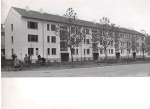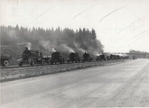 Sechs unterschiedliche Schwarz-Weiß-Fotografien aus dem Unternehmensbereich Bauunternehmung. Auf der ersten Aufnahme ist eine an einem Zugfahrzeug angehängte Kehrmaschine beim Reinigen einer im Bau befindlichen Straße zu erkennen. Das zweite Bild zeigt eine Kolonne von mehr als 10 Fahrzeugen, die den erhitzten Teerbelag zur Asphaltierung des Autobahnabschnittes München-Kempten 1968 anliefern. Das dritte Bild zeigt eine Gruppe von Arbeitern beim Herstellen einer Straßenschicht. Ein Teil der Gruppe ist mit dem Aufbringen einer Teermasse mittels Schläuchen bzw. Spritzen und der andere Teil per Hand mit dem gleichmäßigen Verteilen von Split, der sich in Handkarren befindet, beschäftigt. Das vierte Foto zeigt die erbaute und noch eingerüstete katholische Kirche in Zweibrücken. Das fünfte Bild ist in der Winzlerstraße in Pirmasens entstanden. Es ist ein dreigeschossiger Wohnblock der vom Bauunternehmen Zettelmeyer, Konz errichtet wurde. und davor mehrere mit der Herstellung der Außenanlage beschäftigte Arbeiter zu erkennen. Das sechste Bild zeigt einen Zettelmeyer Radlader Typ KL 30, der in einem Steinbruch einen größeren Felsblock abtransportiert.