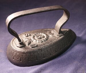 Relativ dickes ovales Flacheisen, eine Zwischenform zwischen Flacheisen und Blockeisen. Das Eisen besitzt einen Metallbügel im Rheinischen Stil als Griff. darunterdie Initialen S D des Herstellers. Um die Oberseite des Eisens läuft am Rand ein niedriger Wulst. Der eiserne Bügel besteht aus einem an 2 Stellen auf dem Eisen angeschweißten Eisenband. Die Seiten des Eisens sind rund herum mit einem Laufmuster verziert. Auf der Oberfläche des Eisens befindet sich als Größenmarke die Zahl 6 in einer Perlenkette mit Palmenblättern vorne und hinten. Die hinteren Palmenblätter werden von den Initialen S und D flankiert. Sie Seiten des Blocks sind abgeschrägt und mit einem laufenden Band verziert. Die Verzierungen könnten auf einen Herkunftsort in Frankreich hinweisen. Das Bügeleisen besitzt eine Bügel in Form eines Eisenbands der vorne fast bis zur Spitze des Eisens reicht und einen etwas erhöhten Rand. Der Rost zum Abstellen des (heißen) Bügeleisens ist vorhanden. Das Flachbügeleisen gehört zu den massiven Volleisen, die aus Eisen oder Stahl geschmiedet oder gegossen und bereits ab dem 18. Jh. hergestellt wurden. Auf Grund seines geringen Gewichts und seiner flachen Sohle, die nahezu mühelos über die vorher mit Wasser besprengte Wäsche gleitet, erfreute es sich noch weit bis ins 20. Jahrhundert hinein großer Beliebtheit. Das Erhitzen auf dem Kohleofen oder in einer offenen Feuerstelle wie dem Kaminfeuer erforderte jedoch verschiedene Vorsichtsmaßnahmen, um die Bügelwäsche nicht zu beschmutzen oder sich am fest verbundenen Metallgriff zu verbrennen. Viele Büglerinnen wischten daher nach dem Erhitzen des Eisens mit einem Tuch, das sie an ihrer Schürze befestigt hatten, über die Bügelsohle. Als Hitzeschutz wurde oftmals ein dicker Handschuh oder ein Lappen, der um den Griff gewickelt wurde, verwendet.
