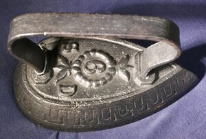 Relativ dickes ovales Flacheisen, eine Zwischenform zwischen Flacheisen und Blockeisen. Das Eisen besitzt einen Metallbügel im Rheinischen Stil als Griff. darunterdie Initialen S D des Herstellers. Um die Oberseite des Eisens läuft am Rand ein niedriger Wulst. Der eiserne Bügel besteht aus einem an 2 Stellen auf dem Eisen angeschweißten Eisenband. Die Seiten des Eisens sind rund herum mit einem Laufmuster verziert. Auf der Oberfläche des Eisens befindet sich als Größenmarke die Zahl 6 in einer Perlenkette mit Palmenblättern vorne und hinten. Die hinteren Palmenblätter werden von den Initialen S und D flankiert. Sie Seiten des Blocks sind abgeschrägt und mit einem laufenden Band verziert. Die Verzierungen könnten auf einen Herkunftsort in Frankreich hinweisen. Das Bügeleisen besitzt eine Bügel in Form eines Eisenbands der vorne fast bis zur Spitze des Eisens reicht und einen etwas erhöhten Rand. Der Rost zum Abstellen des (heißen) Bügeleisens ist vorhanden. Das Flachbügeleisen gehört zu den massiven Volleisen, die aus Eisen oder Stahl geschmiedet oder gegossen und bereits ab dem 18. Jh. hergestellt wurden. Auf Grund seines geringen Gewichts und seiner flachen Sohle, die nahezu mühelos über die vorher mit Wasser besprengte Wäsche gleitet, erfreute es sich noch weit bis ins 20. Jahrhundert hinein großer Beliebtheit. Das Erhitzen auf dem Kohleofen oder in einer offenen Feuerstelle wie dem Kaminfeuer erforderte jedoch verschiedene Vorsichtsmaßnahmen, um die Bügelwäsche nicht zu beschmutzen oder sich am fest verbundenen Metallgriff zu verbrennen. Viele Büglerinnen wischten daher nach dem Erhitzen des Eisens mit einem Tuch, das sie an ihrer Schürze befestigt hatten, über die Bügelsohle. Als Hitzeschutz wurde oftmals ein dicker Handschuh oder ein Lappen, der um den Griff gewickelt wurde, verwendet.