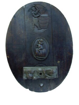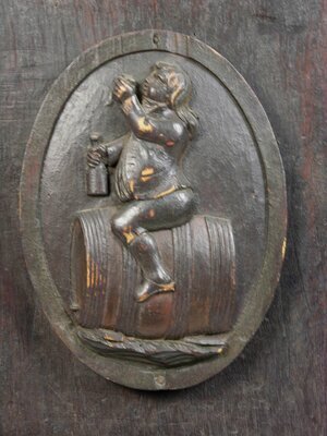 Bei dem Objekt handelt es sich um einen hochovalen Fassboden aus Eichenholz. Ihn zieren zwei eingeschnitzte, ovale Reliefmedaillons. In der Mitte des Bodens ist ein feister Zecher rittlings auf einem Fass sitzend dargestellt, der mit der rechten Hand eine Flasche umfasst und mit der linken Hand einen Becher zum Mund führt. Im oberen Medaillon ist ein Küfer mit Arbeitsschürze und Werkzeugen beim Bereifen eines Fasses dargestellt. Fasstürchen und Fassriegel haben sich erhalten. Der zugehörige Riegel hat die Form eines Löwen.