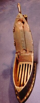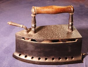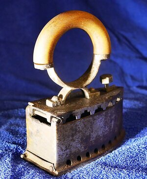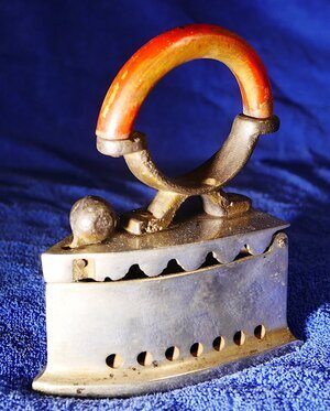 Bügeleisen werden seit dem 17. Jahrhundert zum Glätten der Wäsche verwendet. Die ersten Bügeleisen bestanden aus einer Metallplatte und einem bügelartigem Griff. Daher auch der Name. Auffällig bei diesem Eisen sind insgesamt 18 Löcher direkt über dem Boden. Es hat damit die typische Eigenschaft eines Schweizereisens, könnte aber auch - ohne den vorhandenen Rost - auch als Glühstoffeisen genutzt worden sein. Allerdings besitzt es (noch) nicht die für spätere Glühstoffeisen typischen Rippen im inneren des Eisens. Glühstoff ist eine Art Holzkohlenbrikett, gepulverte Holzkohle, die mit Teer und Natronlauge behandelt in Form gepresst und verkokt (entgast) wurde. Glühstoff diente zum Kochen, Plätten, Bügeln, Warmhalten etc. Ein sogenannter Glühbolzen wurde zum Bügeln außerhalb des Eisens angezündet und in das Eisen eingeführt. Er konnte bis zu 10 Stunden ununterbrochen glühen und so das Fortarbeiten ermöglichen. Im Vergleich zum Kohlebügeleisen hat er kaum Staub, Ruß und Giftgase emittiert. Diese Fortschritte wurden nicht nur in Fachzeitschriften ausführlich beworben. In den aufklappbaren Deckel eines Glühstoffeisens konnte der außerhalb des Eisens angezündete Glühstoff eingefüllt werden. Die Bügelsohle besteht aus dickem Eisenblech, der Glühstoffbehälter besteht aus dünnerem Eisen. Die Bügelsohle ragt in hinteren Teil minimal über den Kohle- bzw. Glühstoffbehälter heraus. Mit einer Klappe auf der Rückseiten, unten über der Bügelsohle, konnte Asche ausgeschüttet werden. in Holzgriff ist mit von unten am Deckel angeschraubten Säulen an diesem befestigt. Vor diesen befindet sich ein Griff mit dem der Deckel durch Drehen verschlossen und wieder geöffnet werden kann. An allen drei Seiten des Bügeleisens befinden sich ganz unten und ganz oben kleine Löcher zur Ermöglichung der Luftzirkulation. Leider keine Informationen zum Herstelle und zum Baujahr.