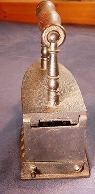 Bügeleisen werden seit dem 17. Jahrhundert zum Glätten der Wäsche verwendet. Die ersten Bügeleisen bestanden aus einer Metallplatte und einem bügelartigem Griff. Daher auch der Name. Auffällig bei diesem Eisen sind insgesamt 18 Löcher direkt über dem Boden. Es hat damit die typische Eigenschaft eines Schweizereisens, könnte aber auch - ohne den vorhandenen Rost - auch als Glühstoffeisen genutzt worden sein. Allerdings besitzt es (noch) nicht die für spätere Glühstoffeisen typischen Rippen im inneren des Eisens. Glühstoff ist eine Art Holzkohlenbrikett, gepulverte Holzkohle, die mit Teer und Natronlauge behandelt in Form gepresst und verkokt (entgast) wurde. Glühstoff diente zum Kochen, Plätten, Bügeln, Warmhalten etc. Ein sogenannter Glühbolzen wurde zum Bügeln außerhalb des Eisens angezündet und in das Eisen eingeführt. Er konnte bis zu 10 Stunden ununterbrochen glühen und so das Fortarbeiten ermöglichen. Im Vergleich zum Kohlebügeleisen hat er kaum Staub, Ruß und Giftgase emittiert. Diese Fortschritte wurden nicht nur in Fachzeitschriften ausführlich beworben. In den aufklappbaren Deckel eines Glühstoffeisens konnte der außerhalb des Eisens angezündete Glühstoff eingefüllt werden. Die Bügelsohle besteht aus dickem Eisenblech, der Glühstoffbehälter besteht aus dünnerem Eisen. Die Bügelsohle ragt in hinteren Teil minimal über den Kohle- bzw. Glühstoffbehälter heraus. Mit einer Klappe auf der Rückseiten, unten über der Bügelsohle, konnte Asche ausgeschüttet werden. in Holzgriff ist mit von unten am Deckel angeschraubten Säulen an diesem befestigt. Vor diesen befindet sich ein Griff mit dem der Deckel durch Drehen verschlossen und wieder geöffnet werden kann. An allen drei Seiten des Bügeleisens befinden sich ganz unten und ganz oben kleine Löcher zur Ermöglichung der Luftzirkulation. Leider keine Informationen zum Herstelle und zum Baujahr.