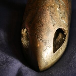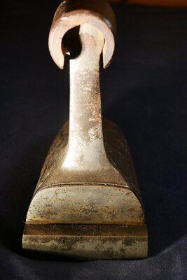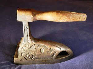 Dieses Bügeleisen wurde über einen externen Gasbrenner aufgeheizt. Der Gasbrenner wurde mit Gasluftgemisch gespeist. Gasbügeleisen waren im 19./20. Jahrhundert im Gebrauch und wurden erst durch Elektrobügeleisen abgelöst. Aus diesem Grund hat es eine geöffnete Rückseite und zwei "Augen" an der Vorderseite. Das Bügeleisen selbst ist in einem einzigen Stück hergestellt (wahrscheinlich Guss) worden, lediglich die Griffangel wurde mit einem Stück Holz versehen. Die beiden Seiten des Eisens sind mit Halbreliefs im Stil des Historismus mit jeweils einem geflügelten Drachen mit langem sehr kunstvollen Schwanz geschmückt. Die Seiten der Säule zum Griff mit einem Ornament. Der Griff ist aus dunkelbraun gestrichenem Holz. Die Vernickelung wurde durch häufigen Gebrauch teilweise abgetragen,