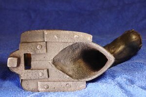 Kohlebügeleisen mit Kamin in Drachenform. In den Bauch des Bügeleisens wurde glühende (Holz-)Kohle eingefüllt um dessen Boden für das Bügeln zu erhitzen. Um diese in den Bauch des Bügeleisens einzufüllen, musste der Deckel abgenommen werden. Dieser ist nicht wie bei vielen anderen Kohlebügeleisen mit einem Scharnier befestigt, sondern mit einer Öse, die mit einem Stift fixiert werden kann. Der beiliegende Nagel dürft nicht zur Originalausstattung gehört haben. Die Befestigung auf der anderen Seite - unter dem Hals des Drachens - erfolgt durch eine sehr dünne Blechplatte die unten am Deckel angebracht ist und die deren Vorderseite in zwei Halterungen am Eisen eingeschoben wird. Frische Luft wird durch eine Öffnung am hinteren Ende mittels eines nicht mehr vorhandenen Blasebalgs über einen Kanal in die Mitte der Kammer unter die Holzkohle eingeblasen. Die Abgase und der Rauch können durch einen Kamin in Drachenform abziehen. Dieser besitzt unten eine große Öffnung für den Rauchabzug. Der gedrechselte Holzgriff ist auf der einen Seite am Kamin auf der anderen Seite an einer Säule befestigt. Im Vergleich zu Kohlebügeleisen mit Rauchabzug unter dem Deckel des Eisens hat diese Konstruktion den Vorteil, dass die Büglerin nicht voll den gesundheitsschädlichen Rauch abbekommt. Bügeleisen dieser Art wurden wahlweise mit der Kaminöffnung links oder rechts angeboten, je nachdem ob die Büglerin Links- oder Rechtshänderin war.