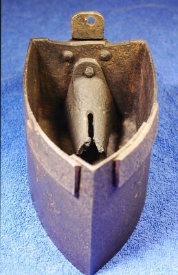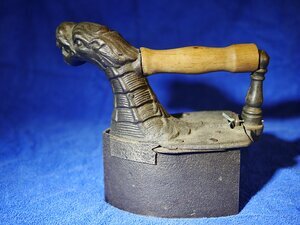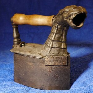 Kamineisen (Kohlebügeleisen) mit Kamin und Drachenkopf