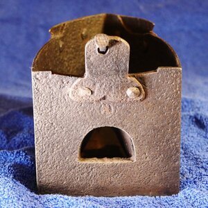 Kohlebügeleisen mit Kamin in Drachenform. In den Bauch des Bügeleisens wurde glühende (Holz-)Kohle eingefüllt um dessen Boden für das Bügeln zu erhitzen. Um diese in den Bauch des Bügeleisens einzufüllen, musste der Deckel abgenommen werden. Dieser ist nicht wie bei vielen anderen Kohlebügeleisen mit einem Scharnier befestigt, sondern mit einer Öse, die mit einem Stift fixiert werden kann. Der beiliegende Nagel dürft nicht zur Originalausstattung gehört haben. Die Befestigung auf der anderen Seite - unter dem Hals des Drachens - erfolgt durch eine sehr dünne Blechplatte die unten am Deckel angebracht ist und die deren Vorderseite in zwei Halterungen am Eisen eingeschoben wird. Frische Luft wird durch eine Öffnung am hinteren Ende mittels eines nicht mehr vorhandenen Blasebalgs über einen Kanal in die Mitte der Kammer unter die Holzkohle eingeblasen. Die Abgase und der Rauch können durch einen Kamin in Drachenform abziehen. Dieser besitzt unten eine große Öffnung für den Rauchabzug. Der gedrechselte Holzgriff ist auf der einen Seite am Kamin auf der anderen Seite an einer Säule befestigt. Im Vergleich zu Kohlebügeleisen mit Rauchabzug unter dem Deckel des Eisens hat diese Konstruktion den Vorteil, dass die Büglerin nicht voll den gesundheitsschädlichen Rauch abbekommt. Bügeleisen dieser Art wurden wahlweise mit der Kaminöffnung links oder rechts angeboten, je nachdem ob die Büglerin Links- oder Rechtshänderin war.