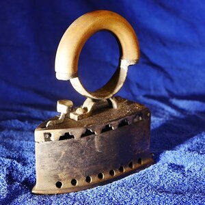 Bügeleisen werden seit dem 17. Jahrhundert zum Glätten der Wäsche verwendet. Die ersten Bügeleisen bestanden aus einer Metallplatte und einem bügelartigem Griff. Daher auch der Name. Das Bügeleisen ist sehr klein. Für ein Kinderbügeleisen ist es jedoch etwas zu groß und zu schwer und Kinder ein glühend heißes Bügeleisen war sicher kein Kinderspielzeug. So ist der Einsatz zum Bügeln kleiner Objekte wie Spitzen oder Krägen naheliegender. Auffällig bei diesem Eisen sind insgesamt 16 Löcher direkt über dem Boden. Es hat damit die typische Eigenschaft eines Schweizereisens, könnte aber auch (da ohne Rost) als Glühstoffeisen genutzt worden sein. Allerdings besitzt es (noch) nicht die für spätere Glühstoffeisen typischen Rippen im inneren des Eisens. Glühstoff ist eine Art Holzkohlenbrikett, gepulverte Holzkohle, die mit Teer und Natronlauge behandelt in Form gepresst und verkokt (entgast) wurde. Glühstoff diente zum Kochen, Plätten, Bügeln, Warmhalten etc. Ein sogenannter Glühbolzen wurde zum Bügeln außerhalb des Eisens angezündet und in das Eisen eingeführt. Er konnte bis zu 10 Stunden ununterbrochen glühen und so das Fortarbeiten ermöglichen. Im Vergleich zum Kohlebügeleisen hat er kaum Staub, Ruß und Giftgase emittiert. Diese Fortschritte wurden nicht nur in Fachzeitschriften ausführlich beworben. In den aufklappbaren Deckel eines Glühstoffeisens konnte der außerhalb des Eisens angezündete Glühstoff eingefüllt werden. Die Bügelsohle besteht aus dickem Eisenblech, der Glühstoffbehälter besteht aus dünnerem Eisen. Die Bügelsohle ragt in hinteren Teil über den Kohle- bzw. Glühstoffbehälter heraus. Mit einer Klappe auf der Rückseiten, unten über der Bügelsohle, konnte Asche ausgeschüttet werden. in Holzgriff ist mit Eisenbändern und Nieten am Deckel befestigt. Vor dieser befindet sich ein gusseisener Knauf mit dem der Deckel verschlossen und wieder geöffnet werden konnte. An allen drei Seiten des Bügeleisens befinden sich ganz unten und ganz oben kleine Löcher zur Ermöglichung der Luftzirkulation. Leider keine Informationen zum Hersteller. An der Unterseite des Deckels befindet sich die Ziffer (Gussmarke?) 8.