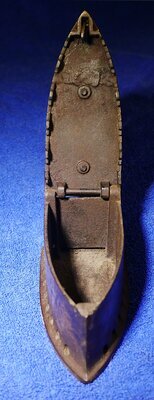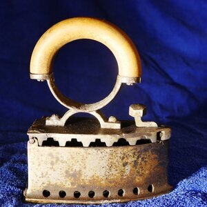 Bügeleisen werden seit dem 17. Jahrhundert zum Glätten der Wäsche verwendet. Die ersten Bügeleisen bestanden aus einer Metallplatte und einem bügelartigem Griff. Daher auch der Name. Das Bügeleisen ist sehr klein. Für ein Kinderbügeleisen ist es jedoch etwas zu groß und zu schwer und Kinder ein glühend heißes Bügeleisen war sicher kein Kinderspielzeug. So ist der Einsatz zum Bügeln kleiner Objekte wie Spitzen oder Krägen naheliegender. Auffällig bei diesem Eisen sind insgesamt 16 Löcher direkt über dem Boden. Es hat damit die typische Eigenschaft eines Schweizereisens, könnte aber auch (da ohne Rost) als Glühstoffeisen genutzt worden sein. Allerdings besitzt es (noch) nicht die für spätere Glühstoffeisen typischen Rippen im inneren des Eisens. Glühstoff ist eine Art Holzkohlenbrikett, gepulverte Holzkohle, die mit Teer und Natronlauge behandelt in Form gepresst und verkokt (entgast) wurde. Glühstoff diente zum Kochen, Plätten, Bügeln, Warmhalten etc. Ein sogenannter Glühbolzen wurde zum Bügeln außerhalb des Eisens angezündet und in das Eisen eingeführt. Er konnte bis zu 10 Stunden ununterbrochen glühen und so das Fortarbeiten ermöglichen. Im Vergleich zum Kohlebügeleisen hat er kaum Staub, Ruß und Giftgase emittiert. Diese Fortschritte wurden nicht nur in Fachzeitschriften ausführlich beworben. In den aufklappbaren Deckel eines Glühstoffeisens konnte der außerhalb des Eisens angezündete Glühstoff eingefüllt werden. Die Bügelsohle besteht aus dickem Eisenblech, der Glühstoffbehälter besteht aus dünnerem Eisen. Die Bügelsohle ragt in hinteren Teil über den Kohle- bzw. Glühstoffbehälter heraus. Mit einer Klappe auf der Rückseiten, unten über der Bügelsohle, konnte Asche ausgeschüttet werden. in Holzgriff ist mit Eisenbändern und Nieten am Deckel befestigt. Vor dieser befindet sich ein gusseisener Knauf mit dem der Deckel verschlossen und wieder geöffnet werden konnte. An allen drei Seiten des Bügeleisens befinden sich ganz unten und ganz oben kleine Löcher zur Ermöglichung der Luftzirkulation. Leider keine Informationen zum Hersteller. An der Unterseite des Deckels befindet sich die Ziffer (Gussmarke?) 8.