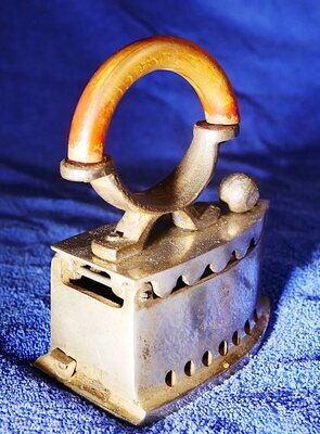 Bügeleisen werden seit dem 17. Jahrhundert zum Glätten der Wäsche verwendet. Die ersten Bügeleisen bestanden aus einer Metallplatte und einem bügelartigem Griff. Daher auch der Name. Das Bügeleisen ist sehr klein. Für ein Kinderbügeleisen ist es jedoch etwas zu groß und zu schwer und Kinder ein glühend heißes Bügeleisen war sicher kein Kinderspielzeug. So ist der Einsatz zum Bügeln kleiner Objekte wie Spitzen oder Krägen naheliegender. Auffällig bei diesem Eisen sind insgesamt 14 Löcher direkt über dem Boden. Es hat damit die typische Eigenschaft eines Schweizereisens, könnte aber auch (da ohne Rost) als Glühstoffeisen genutzt worden sein. Allerdings besitzt es (noch) nicht die für spätere Glühstoffeisen typischen Rippen im inneren des Eisens. Glühstoff ist eine Art Holzkohlenbrikett, gepulverte Holzkohle, die mit Teer und Natronlauge behandelt in Form gepresst und verkokt (entgast) wurde. Glühstoff diente zum Kochen, Plätten, Bügeln, Warmhalten etc. Ein sogenannter Glühbolzen wurde zum Bügeln außerhalb des Eisens angezündet und in das Eisen eingeführt. Er konnte bis zu 10 Stunden ununterbrochen glühen und so das Fortarbeiten ermöglichen. Im Vergleich zum Kohlebügeleisen hat er kaum Staub, Ruß und Giftgase emittiert. Diese Fortschritte wurden nicht nur in Fachzeitschriften ausführlich beworben. In den aufklappbaren Deckel eines Glühstoffeisens konnte der außerhalb des Eisens angezündete Glühstoff eingefüllt werden. Die Bügelsohle besteht aus dickem Eisenblech, der Glühstoffbehälter besteht aus dünnerem Eisen. Die Bügelsohle ragt in hinteren Teil über den Kohle- bzw. Glühstoffbehälter heraus. Mit einer Klappe auf der Rückseiten, unten über der Bügelsohle, konnte Asche ausgeschüttet werden. in Holzgriff ist mit Eisenbändern und Nieten am Deckel befestigt. Vor dieser befindet sich ein gusseisener Knauf mit dem der Deckel verschlossen und wieder geöffnet werden konnte. An allen drei Seiten des Bügeleisens befinden sich ganz unten und ganz oben kleine Löcher zur Ermöglichung der Luftzirkulation. Leider keine Informationen zum Hersteller.