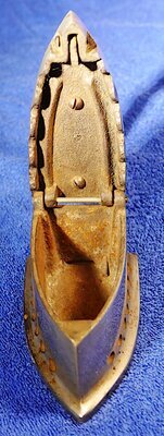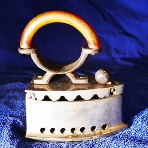 Bügeleisen werden seit dem 17. Jahrhundert zum Glätten der Wäsche verwendet. Die ersten Bügeleisen bestanden aus einer Metallplatte und einem bügelartigem Griff. Daher auch der Name. Das Bügeleisen ist sehr klein. Für ein Kinderbügeleisen ist es jedoch etwas zu groß und zu schwer und Kinder ein glühend heißes Bügeleisen war sicher kein Kinderspielzeug. So ist der Einsatz zum Bügeln kleiner Objekte wie Spitzen oder Krägen naheliegender. Auffällig bei diesem Eisen sind insgesamt 14 Löcher direkt über dem Boden. Es hat damit die typische Eigenschaft eines Schweizereisens, könnte aber auch (da ohne Rost) als Glühstoffeisen genutzt worden sein. Allerdings besitzt es (noch) nicht die für spätere Glühstoffeisen typischen Rippen im inneren des Eisens. Glühstoff ist eine Art Holzkohlenbrikett, gepulverte Holzkohle, die mit Teer und Natronlauge behandelt in Form gepresst und verkokt (entgast) wurde. Glühstoff diente zum Kochen, Plätten, Bügeln, Warmhalten etc. Ein sogenannter Glühbolzen wurde zum Bügeln außerhalb des Eisens angezündet und in das Eisen eingeführt. Er konnte bis zu 10 Stunden ununterbrochen glühen und so das Fortarbeiten ermöglichen. Im Vergleich zum Kohlebügeleisen hat er kaum Staub, Ruß und Giftgase emittiert. Diese Fortschritte wurden nicht nur in Fachzeitschriften ausführlich beworben. In den aufklappbaren Deckel eines Glühstoffeisens konnte der außerhalb des Eisens angezündete Glühstoff eingefüllt werden. Die Bügelsohle besteht aus dickem Eisenblech, der Glühstoffbehälter besteht aus dünnerem Eisen. Die Bügelsohle ragt in hinteren Teil über den Kohle- bzw. Glühstoffbehälter heraus. Mit einer Klappe auf der Rückseiten, unten über der Bügelsohle, konnte Asche ausgeschüttet werden. in Holzgriff ist mit Eisenbändern und Nieten am Deckel befestigt. Vor dieser befindet sich ein gusseisener Knauf mit dem der Deckel verschlossen und wieder geöffnet werden konnte. An allen drei Seiten des Bügeleisens befinden sich ganz unten und ganz oben kleine Löcher zur Ermöglichung der Luftzirkulation. Leider keine Informationen zum Hersteller.