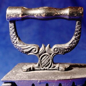 Bügeleisen werden seit dem 17. Jahrhundert zum Glätten der Wäsche verwendet. Die ersten Bügeleisen bestanden aus einer Metallplatte und einem bügelartigem Griff. Daher auch der Name. Das vorliegende Bügeleisen ist ein sogenanntes Augeneisen. Augeneisen wurden seit etwa 1870 hergestellt und sind die Weiterentwicklung eines sogenanntes Kohleneisen. Die Augen dienen zur Verbesserung der Luftzufuhr. Kohleisen sind ein Bügeleisen aus Eisen mit nach hinten aufklappbarem Deckel mit Holzgriff. In den aufklappbaren Deckel eines Kohleneisens konnte glühende (Holz-)Kohlenasche eingefüllt werden. Die Bügelsohle besteht aus dickem Eisenblech, der Kohlebehälter besteht aus dünnerem Eisen. Die Bügelsohle ragt in hinteren Teil über den Kohlebehälter heraus. Mit einer Klappe auf der Rückseiten, unten über der Bügelsohle, konnte Asche ausgeschüttet werden. Der gedrechselte Holzgriff war ursprünglich oder zwischenzeitlich schwarz lackiert. Die gusseisernen Griffstützen sind mit der Abbildung von zwei Delphinen verziert. Vor dieser befindet sich ein Klappverschluss mit einem gusseisener Hahn mit dem der Deckel verschlossen werden konnte. An allen drei Seiten des Bügeleisens befinden sich "Augen", d.h. heißt augenförmige Löcher zur Ermöglichung der Luftzirkulation bei der brennenden Kohle. Der Nachteil dieser Bügeleisen ist, dass bei Unachtsamkeit glühende Holzkohle herausfallen und die Textilien verschmutzen und beschädigen konnte. Des weiteren stand die Büglerin voll in den Abgasen der glühenden Holzkohle und fiel dadurch nicht selten in Ohnmacht. Schöne historische Bügeleisen waren in den 1980er Jahren als Decoobjekte sehr beliebt und wurden weit über den vorhandenen historischen Bestand nachgefragt. Dieses Bügeleisen ist ein Nachtguss aus dieser Zeit - erkennbar an den modernen Schrauben mit denen die Einzelteile befestigt sind und an den Bearbeitungsspuren moderner Werkzeuge.