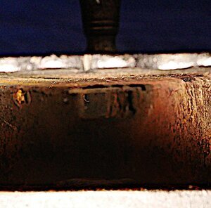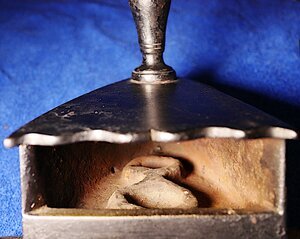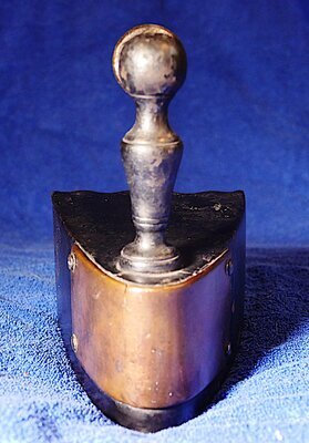 Kastenbügeleisen (oder Flachbolzenbügeleisen) aus Eisen mit schiffförmigem Rumpf. Das Eisen besitzt eine einzige, einzige säulenförimge mit einer Schraube an der Spitze des Eisens befestigte Griffstütze. Der Holzgriff ist oben an der Säule mit einem Gewinde angeschraubt. In den Rumpf kann ein erhitzter Eisenkeil von hinten eingeführt werden. Durch diesen wird der Boden des Bügeleisens erhitzt. Auffällig ist, dass dieses Eisen an der Rückseite weder eine Klappe noch einen Schieber besitzt. Der Keil wird quasi im Ersten Stock eingeworfen fällt dann etwas herunter und wird letztendlich durch die bis auf die halbe Höhe vorhandene Rückwand im Innenraum des Eisens festgehalten. Im Inneren des Eisens befinden sich Rippen in Form einer 8 die verhindern, dass der Eisenkeil direkt auf dem Boden aufliegt. Anscheinend wurde die Spitze des Eisens einmal beschädigt Heute ist sie mit einer von außen um die Spitze gebogene Kupferplatte verstärkt.