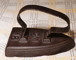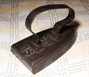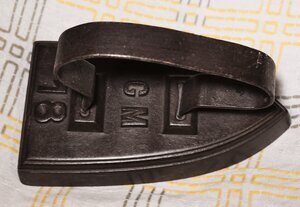 Das vorliegende Bügeleisen ist ein so genanntes Flacheisen aus Gusseisen und besitzt einen angeschweißten Bügel. Bügeleisen werden seit dem 17. Jahrhundert zum Glätten der Wäsche verwendet. Die ersten Bügeleisen bestanden aus einer Metallplatte und einem bügelartigen Griff. Daher auch der Name. Etwa in der Mitte der Oberfläche des Eisens befinden sich die Buchstaben G und M, wahrscheinlich die Initialen des Herstellers. Hinter der hinteren Befestigung des Bügels findet sich die Zahl 18, möglicherweise eine Größenangabe, Flacheisen wurden in Privathaushalten auf der Herdplatte, in gewerblichen Betrieben auch auf speziellen Bügeleisenöfen erhitzt. Das Eisen konnte dann so lange es heiß war zum Glätten der vorher mit Wasser eingesprengten Wäsche verwendet werden. Wurde das Eisen auf oder in einem Kohleofen erhitzt, musste es zuerst von Kohleresten gereinigt werden. War das Eisen zu sehr abgekühlt, musste es gegen ein gerade aufgeheiztes Exemplar ausgetauscht werden. D.h. zum kontinuierlichen Bügeln waren mehrere Bügeleisen vonnöten.