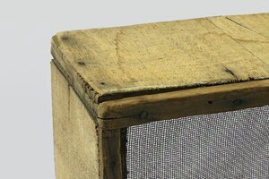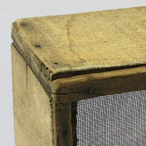 Aus vier 12 mm breiten Mehrschichtholzbrettern (Sperrholz) selbst gebautes Mehlsieb. Die vier Bretter wurden zu einem rechteckigen Kasten zusammengenagelt. Auf eine Öffnung im Rechteck wurde ein feinmaschiges Siel mit dünnen Leister aufgenagelt. Das Holz ist roh, also nicht mit einer Lasur oder Farbe gestrichen. Da nach dem 2. Weltkrieg Haushaltsgeräte nicht einfach im Geschäft beschafft werden konnten wurde das Mehlsieb aus zur Verfügung stehenden Mitteln zusammengebaut. Bei Aufräumarbeiten wurde das Sieb auf einem Dachboden gefunden.