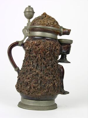 Handgedrehter zylindricher, von unten (94 mm) nach oben dünner werdender (45 mm) Weinkrug mit handgeformter Ausschenknase in Grau. Der Griff ist handgedreht und vor dem Glasieren angeklebt worden. Glasiert ist der Krug mit Salzglasur und vorderseitig mit einem Rankenornament verziert. Verwendet wurde er bei Weinproben im Winzerverein. Dabei wurde der Wein aus den Fässern in den Krug gefüllt und dann in Gläser ausgeschenkt. Ein Signet der Töpferei ist nicht vorhanden.