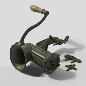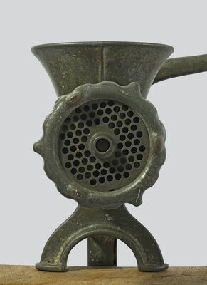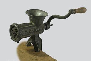 Der verzinnte Fleischwolf ist aus einem Stück gegossen, hat eine Spannvorrichtung mit Flügelschraube und Druckverteilerplatte. Er wird mit Kurbel, die hinter dem Gehäuse mit Einfülltrichter und Zwinge angeschraubt ist betrieben. Die Kurbel dreht eine Förderschnecke, welche das Füllgut nach vorne zu einer Messerscheibe, und der Lochscheibe transportiert. Zerkleinert werden können u. a. Fleischstücke zu Hackfleisch. In der Weihnachtsbäckerei die Mühle beliebt um Spritzgebackenes herzustellen. Auf dem Korpus steht auf beiden Seiten "ALEXANDERWERK 10".