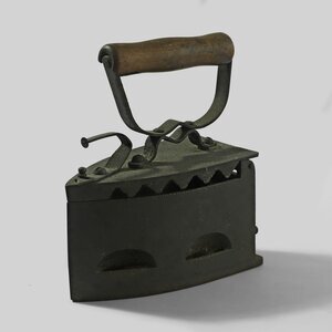 Das Bügeleisen aus Eisen hat einen nach hinten aufklappbarem Deckel mit Holzgriff. Die Bügelsohle besteht aus dickem Eisenblech, der Kohlebehälter besteht aus dünnerem Eisen und ist oberhalb der Bügelsohle auf jeder Seite mit einer Öffnung versehen. Nach Innen ist die Öffnung mit einer nach unten offener Wand ausgeführt, die verhindern soll das glühende Kohle auf das zu bügelnde Wäschestück fallen kann. Die Bügelsohle ragt in hinteren Teil über den Kohlebehälter heraus. An Deckelrand sind dreiecksartige Öffnungen vorhanden, über die der Rauch der Kohle entweichen konnte. Der Deckelverschluß hat ein drehbarer Hacken mit dem der Deckel mit dem Unterteil arretiert werden kann. Auf den Deckel ist eine Griffhalterung mit Holzgriff aufgeschraubt. Über eine Klappe auf der Rückseite des Bügeleisens konnte Asche ausgeschüttet werden.