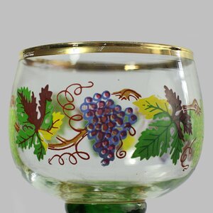 Der Fuß besteht aus grünem Glas und einem aufgesetzten transparenten Kelch, der farblich mit Reben und Weinblätter dekoriert ist. Der obere Rand ist mit einem goldfarbenen Band dekoriert. Diese Gläser wurden in Weinorten als Touristenware verkauft. Ein Hersteller ist auf dem Objekt nicht vermerkt.