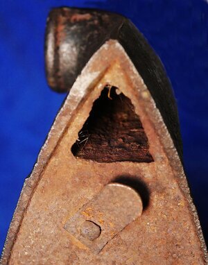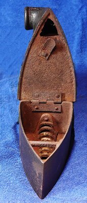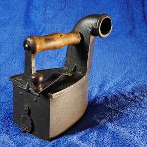 Kleines Kohlebügeleisen mit Kamin. Der Hersteller ist Union Cerrajera de Mondragón (UCEM) aus dem spanischen Baskenland. Der Kamin des Bügeleisens ist relativ schlicht gestaltet, ohne den bei Vergleichsexemplaren oft vorhandenen Drachenkopf. Der gedrechselte Holzgriff ist auf der einen Seite am Kamin auf der anderen Seite mit einem Metallband befestigt. Auf der Rückseite befindet sich eine runde Klappe zur Regulierung des Luftzugs. An dieser kann auch ein Balg angebracht werden um mit diesem die Kohlen im Eisen anzufeuern. Auf der oberen Hälfte der Klappe befindet sich der schlecht lesbarer Schriftzug MONDRAGON unter diesem die beiden Buchstaben U und C. Es handelt sich dabei um den Herstellernamen. Auf dem Deckel des Eisens befindet sich eine Gussmarke mit nicht mehr erkennbaren Inhalt. Der Deckel kann mit einem drehbaren Riegel verschlossen werden. Der Deckel des Bügeleisens ist mit einem Scharnier an der Rückseite verbunden und kann nach hinten hochgeklappt werden. Nach der Befüllung des Eisens wurde der Deckel wieder heruntergeklappt und mit einem Riegel verschlossen . Durch einen kleinen Kamin kann der Rauch abziehen. In den Bauch des Bügeleisens wurde glühende (Holz-)Kohle eingefüllt um dessen Boden für das Bügeln zu erhitzen. Im Vergleich zu Kohlebügeleisen mit Rauchabzug unter dem Deckel des Eisens hat diese Konstruktion den Vorteil, dass die Büglerin nicht voll den gesundheitsschädlichen Rauch abbekommt. Das Bügeleisen wurde wahlweise mit der Kaminöffnung links oder rechts angeboten, je nachdem ob die Büglerin Links- oder Rechtshänderin war.