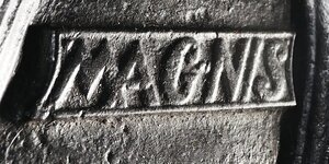 Flachbügeleisen der Marke MAGNIS. Es besitzt einen angegossenen Bügelgriff mit Nase - eine eigentlich typisch französische Form - und einen in zwei Stufen erhöhten Rand. In der Mitte des Eisens befindet sich leicht erhöht der Schriftzug MAGNIS. Links von der hinteren Bügelstütze befindet sich ein N, rechts von dieser eine 6 - was die Größenangabe dieses Eisens ist. Der Innenraum ist von zwei geschwungenen Bögen umgeben Der Name MAGNIS deutet auf das gleichnamige Adelsgeschlecht der in Preußen wie in Österreich reichbegüterten Reichsgrafen von Magnis hin, die in Neurode in der Grafschaft Glatz, heute Nowa Ruda in der Woiwodschaft Niederschlesien in Polen. Das leichte Flachbügeleisen gehört zu den massiven Volleisen, die aus Eisen oder Stahl geschmiedet oder gegossen und bereits ab dem 18. Jh. hergestellt wurden. Auf Grund seines geringen Gewichts und seiner flachen Sohle, die nahezu mühelos über die vorher mit Wasser besprengte Wäsche gleitet, erfreute es sich noch weit bis ins 20. Jahrhundert hinein großer Beliebtheit. Das Erhitzen auf dem Kohleofen oder in einer offenen Feuerstelle wie dem Kaminfeuer erforderte jedoch verschiedene Vorsichtsmaßnahmen, um die Bügelwäsche nicht zu beschmutzen oder sich am fest verbundenen Metallgriff zu verbrennen. Viele Büglerinnen wischten daher nach dem Erhitzen des Eisens mit einem Tuch, das sie an ihrer Schürze befestigt hatten, über die Bügelsohle. Als Hitzeschutz wurde oftmals ein dicker Handschuh oder ein Lappen, der um den Griff gewickelt wurde, verwendet.