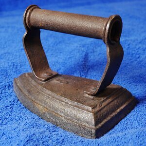 Einfaches Flachbügeleisen mit schrägen mit wulstartigen Seiten. Auf der Oberfläche befindet sich die Größenangabe 5. Der röhrenartige gerade Griff wird von 2 Metallbändern gehalten, welche wiederum mit Nieten auf dem Eisen befestigt sind. Die Röhre speicherte nicht so viel Hitze wie ein Metallband und war deshalb auch einfacher und mit weniger Aufwand zu isolieren. Nicht nur weil der Durchmesser der Röhre deutlich kleiner ist als der der Befestigungen kann man davon ausgehen, dass die Röhre früher mit Leder ummantelt war um die Büglerin vor der Hitze des Eisens zu schützen und das Umwickeln eine reinen Metallgriffs überflüssig zu machen. Der röhrenartige Griff und das Symbol auf der Oberfläche des Eisens deuten auf eine Entstehung in England hin. Ein Flacheisen musste das auf der Herdplatte oder an einem Bügeleisenofen erhitzt werden. Das leichte Flachbügeleisen gehört zu den massiven Volleisen, die aus Eisen oder Stahlgeschmiedet oder gegossen und bereits ab dem 18. Jh. hergestellt wurden. Auf Grund seines geringen Gewichts und seiner flachen Sohle, die nahezu mühelos über die vorher mit Wasser besprengte Wäsche gleitet, erfreute es sich noch weit bis ins 20. Jahrhundert hinein großer Beliebtheit. Das Erhitzen auf dem Kohleofen oder in einer offenen Feuerstelle wie dem Kaminfeuer erforderte jedoch verschiedene Vorsichtsmaßnahmen, um die Bügelwäsche nicht zu beschmutzen oder sich am fest verbundenen Metallgriff zu verbrennen. Viele Büglerinnen wischten daher nach dem Erhitzen des Eisens mit einem Tuch, das sie an ihrer Schürze befestigt hatten, über die Bügelsohle. Als Hitzeschutz wurde oftmals ein dicker Handschuh oder ein Lappen, der um den Griff gewickelt wurde, verwendet.