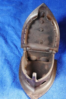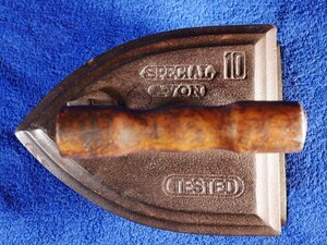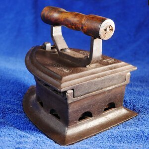 Das Bügeleisen ist ein sogenanntes Augeneisen mit einem gedrechselten Holzgriff. Augeneisen wurden seit etwa 1870 hergestellt und sind die Weiterentwicklung eines sogenanntes Kohleneisen. Die Augen dienen zur Verbesserung der Luftzufuhr. Kohleisen sind ein Bügeleisen aus Eisen mit nach hinten aufklappbarem Deckel mit Holzgriff. Die Bügelsohle besteht aus dickem Eisenblech, der Kohlebehälter besteht aus dünnerem Eisen. Die Bügelsohle ragt in hinteren Teil über den Kohlebehälter heraus. In den aufklappbaren Deckel konnte glühende Kohle eingefüllt werden. An beiden Seiten des Bügeleisens befinden sich unten je zwei "Augen" und zwischen Eisen und Deckel ein Spalt zur Ermöglichung der Luftzirkulation bei der brennenden Kohle. Die Klappe kann mit einem Haken und einem Loch in einem von unten kommenden Stift oberhalb des Deckels fixiert werden. An dem Deckel ist mit 2 Schrauben ein Bügel angeschraubt, der oben von einem gedrechselten Holz umschlossen wird. Auf dem Deckel befinden sich die Schriftzüge "SPECIAL 10", "A-VON" und "TESTED". Könnte eventuell eine Herstellerangabe sein. A-VON könnte sich auf einen indischen Textilhändler in Greater Kailash, New Delhi beziehen. Bügeleisen werden seit dem 17. Jahrhundert zum Glätten der Wäsche verwendet. Die ersten Bügeleisen bestanden aus einer Metallplatte und einem bügelartigem Griff. Daher auch der Name.