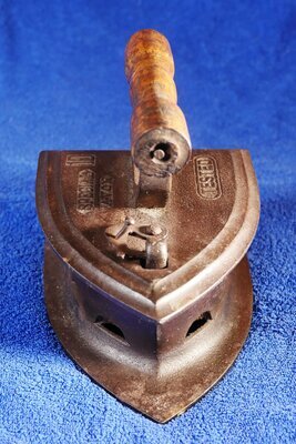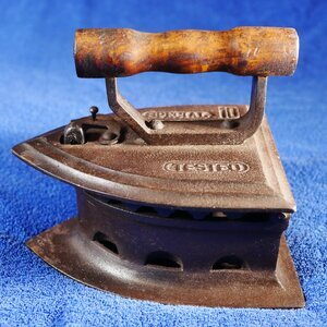 Das Bügeleisen ist ein sogenanntes Augeneisen mit einem gedrechselten Holzgriff. Augeneisen wurden seit etwa 1870 hergestellt und sind die Weiterentwicklung eines sogenanntes Kohleneisen. Die Augen dienen zur Verbesserung der Luftzufuhr. Kohleisen sind ein Bügeleisen aus Eisen mit nach hinten aufklappbarem Deckel mit Holzgriff. Die Bügelsohle besteht aus dickem Eisenblech, der Kohlebehälter besteht aus dünnerem Eisen. Die Bügelsohle ragt in hinteren Teil über den Kohlebehälter heraus. In den aufklappbaren Deckel konnte glühende Kohle eingefüllt werden. An beiden Seiten des Bügeleisens befinden sich unten je zwei "Augen" und zwischen Eisen und Deckel ein Spalt zur Ermöglichung der Luftzirkulation bei der brennenden Kohle. Die Klappe kann mit einem Haken und einem Loch in einem von unten kommenden Stift oberhalb des Deckels fixiert werden. An dem Deckel ist mit 2 Schrauben ein Bügel angeschraubt, der oben von einem gedrechselten Holz umschlossen wird. Auf dem Deckel befinden sich die Schriftzüge "SPECIAL 10", "A-VON" und "TESTED". Könnte eventuell eine Herstellerangabe sein. A-VON könnte sich auf einen indischen Textilhändler in Greater Kailash, New Delhi beziehen. Bügeleisen werden seit dem 17. Jahrhundert zum Glätten der Wäsche verwendet. Die ersten Bügeleisen bestanden aus einer Metallplatte und einem bügelartigem Griff. Daher auch der Name.