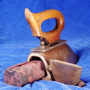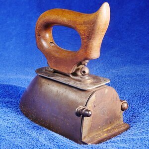 Der Name "Ochsenzungenbügeleisen" kommt daher, weil in das Innere des Bügeleisens ein ochsenzungenförmiger Eisenkeil von hinten eingeschoben werden kann. Dieser wird zuerst auf einem Herd erhitzt, dann eingeschoben und mit diesem der Boden des Bügeleisens erhitzt. Der Innenraum kann mit einer Klappe verschlossen werden, sodass der Eisenkeil nicht nach hinten herausfallen kann. Der hölzerne Griff besitzt hinten eine Nase und sitzt auf einer eigenen Bühne über dem eigentlichen Bügeleisen. Die Bühne ist auf dem Eisen mit zwei Schrauben festgeschraubt.. Am Boden des Innenraums findet sich zweimal zwei Rippen in Form von konzentrischen Kreisen. Diese verhindern, dass der Eisenkeil direkt auf dem Boden aufliegt. Auf der Bühne befinden sich mehrere Punzen mit je einer Kreuzblütlerblüte, dem Logo der Socieéte Vimeu Industrial. Auf dem Deckel hinten eine Punze mit einem Strahlenkranz, in diesem etwas unleserlichem und der Bezeichung "1/2".