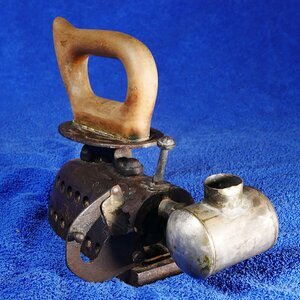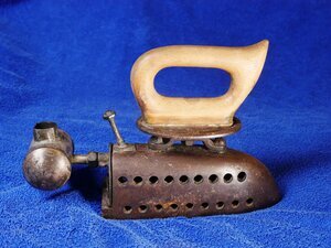 Spiritusbügeleisen wurden zwischen 1847 und 1940 hergestellt. Trotz der Sauberkeit, der bequemen Handhabung und den geringen Betriebskosten bleiben sie was Stückzahlen angeht weit hinter den anderen Typen zurück. Das Bügeleisen besitzt an seiner Rückseite einen Tank in den Brennspiritus eingefüllt werden kann. Dieser wird durch eine Leitung mit einem Docht zur Brennkammer im Bügeleisen geleitet. Vor der Inbetriebnahme des Bügeleisens wird der Brenner herausgenommen und auf den Anheizrost gestellt. Nachdem die Spiritusgase angezündet wurden, wird er in das eigentliche Eisen geschoben und erhitzt dieses. Nach 10 min kann das so vorbereitete Bügeleisen in Betrieb genommen werden. Die insgesamt 36 Löcher in den Seitenwänden dienten der Luftzirkulaltion. Unter dem großen Holzgriff befindet sich eine Stahlplatte mit Asbestunterlage, die die Hand der Büglerin vor den heißen Abgasen aus dem Brenner schützt. Der Deckel auf Vorratsgefäß ist abgängig. Weder Hinweise auf den Hersteller noch auf das Baujahr. Mit der Elektrifizierung ab ca. den 1900er- im ländlichen Bereich ab den 1920er-Jahren wurden diese Bügeleisen durch deutlich einfacher zu bedienende elektrische Bügeleisen abgelöst.