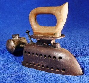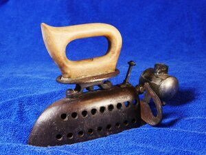Spiritusbügeleisen wurden zwischen 1847 und 1940 hergestellt. Trotz der Sauberkeit, der bequemen Handhabung und den geringen Betriebskosten bleiben sie was Stückzahlen angeht weit hinter den anderen Typen zurück. Das Bügeleisen besitzt an seiner Rückseite einen Tank in den Brennspiritus eingefüllt werden kann. Dieser wird durch eine Leitung mit einem Docht zur Brennkammer im Bügeleisen geleitet. Vor der Inbetriebnahme des Bügeleisens wird der Brenner herausgenommen und auf den Anheizrost gestellt. Nachdem die Spiritusgase angezündet wurden, wird er in das eigentliche Eisen geschoben und erhitzt dieses. Nach 10 min kann das so vorbereitete Bügeleisen in Betrieb genommen werden. Die insgesamt 36 Löcher in den Seitenwänden dienten der Luftzirkulaltion. Unter dem großen Holzgriff befindet sich eine Stahlplatte mit Asbestunterlage, die die Hand der Büglerin vor den heißen Abgasen aus dem Brenner schützt. Der Deckel auf Vorratsgefäß ist abgängig. Weder Hinweise auf den Hersteller noch auf das Baujahr. Mit der Elektrifizierung ab ca. den 1900er- im ländlichen Bereich ab den 1920er-Jahren wurden diese Bügeleisen durch deutlich einfacher zu bedienende elektrische Bügeleisen abgelöst.