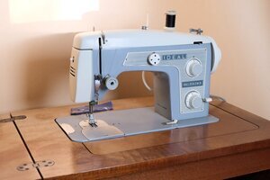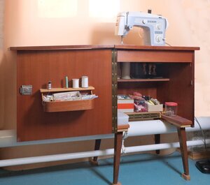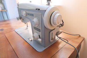 Der Versandhandel Quelle hatte seit Anfang der 1960er Jahre auch Haushaltsnähmaschinen der Modellreihe IDEALim Angebot. Vom Grundsatz her, eine robuste, anspruchslose Maschine die Anfängern vieles verzeiht. Die Modellreihe IDEAL Voll ZickZack konnte wahlweise als Koffer oder Schrank, mit Tret- oder Elektroantrieb über den Katalog bestellt werden. Unser Modell ist eine IDEAL Voll ZichZack Flachbettmaschine. Sie trägt die Seriennummer 716.428 und ist mit einem leistungsstarken Motor und Schnurkettenantrieb ausgestattet. Die zugehörigen Kabel sowie das Fußpadal sind noch vorhanden. Mit dem Fußpedal wird die Nähgeschwindigkeit gesteuert. So lassen sich sehr langsame Geschwindigkeiten aber auch sehr flottes Nähen bewerkstelligen. In das Gehäuse integriert ist eine Nähbeleuchtung. Es ist uns bekannt, dass Quelle Nähmaschinen vorwiegend in Japan eingekauft hat. Dieser Maschinentyp jedoch, wurde im VEB Nähmaschinenwerk "Veritas" in der ehemaligen DDR hergestellt - daher die Aufschrift "Made in Germany". Das zweifarbige Gehäuse – beige/hellgrau- ist aus Metall und in einem Nähschrank integriert. Der hölzerne Schrank ist durchgängig furniert und verfügt im Innern –wegen der fehlenden Trittmechanik- über mehrere Schubladen und Stauraum zum Aufbewahren von Utensilien. Das Objekt befindet sich heute in unserm Hutatelier der Ladengasse II.