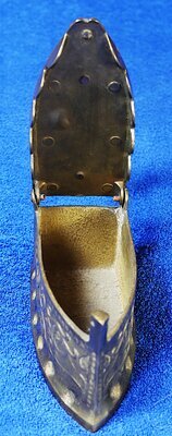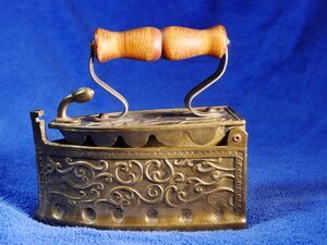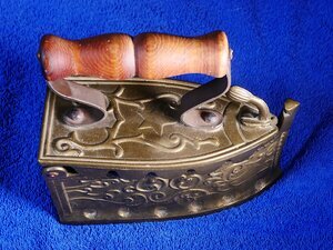 Reines Deko-Bügeleisen aus Messing - etwa aus den 1980er-Jahren. Es ist im Stil eines Schweizereisens gestaltet, ist Aufgrund zu dünner Bodenplatte, zu dünner Wandplatten, und nur angedeuteten Löchern unten an den Seitenteilen nicht zum Bügeln und allenfalls als Dekorationsobjekt und als Blumentopfersatz geeignet. Der unzweckmäßig dünne Riegel des Schließmechanismus ist unterhalb des Deckels abgebrochen. Leider keine Informationen zum Hersteller.