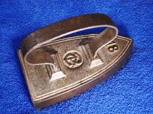 Spitz zulaufendes Flachbügeleisen mit angegossenem Eisenbügel im Rheinischen Stil. An der Spitze befindet sich als Größenangabe die Zahl "18". Zwischen den beiden Bügelbefestigungen befindet die einem Kreis eingelassen Initialen P C. Die beiden Buchstaben sind ineinander verschlungen. Die hinten gerundete Bügelsohle zeichnet es das Eisen als Glanzbügeleisen zum Bügeln von hohen Krägen, Batistblusen etc. aus. Es handelt sich um ein einfaches Flacheisen, das auf der Herdplatte oder an einem Bügeleisenofen erhitzt werden musste. Das Flachbügeleisen gehört zu den massiven Volleisen, die aus Eisen oder Stahlgeschmiedet oder gegossen und bereits ab dem 18. Jh. hergestellt wurden. Auf Grund seiner flachen Sohle, die nahezu mühelos über die vorher mit Wasser besprengte Wäsche gleitet, erfreute es sich noch weit bis ins 20. Jahrhundert hinein großer Beliebtheit. Das Erhitzen auf dem Kohleofen oder in einer offenen Feuerstelle wie dem Kaminfeuer erforderte jedoch verschiedene Vorsichtsmaßnahmen, um die Bügelwäsche nicht zu beschmutzen oder sich am fest verbundenen Metallgriff zu verbrennen. Viele Büglerinnen wischten daher nach dem Erhitzen des Eisens mit einem Tuch, das sie an ihrer Schürze befestigt hatten, über die Bügelsohle. Als Hitzeschutz wurde oftmals ein dicker Handschuh oder ein Lappen, der um den Griff gewickelt wurde, verwendet.